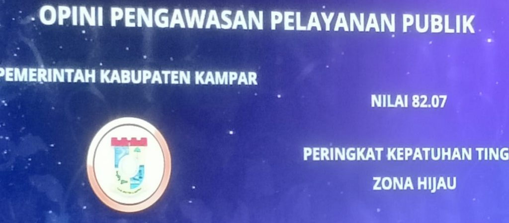 Kabupaten Kampar menerima penghargaan dengan kategori Kepatuhan Tinggi/Zona Hijau dengan nilai 82,07 yang diserahkan langsung oleh Ketua Ombudsman Republik Indonesia, Mokhammad Najihdan diterima langsung oleh Pj. Bupati Kampar, Dr. H. Kamsol, MM