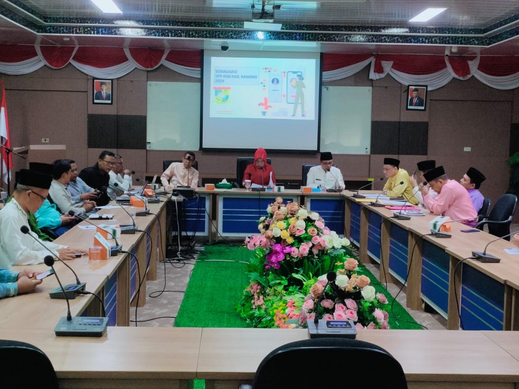 Bagian Organisasi Kabupaten Kampar Sekretariat Daerah Kabupaten Kampar menggelar Sosialisasi kebijakan tambahan Penghasilan Pegawai (TPP) tahun 2024. Kegiatan ini dibuka oleh Pj. Sekretaris Daerah Kabupaten Kampar, didampingi oleh Asisten Administrasi Umum Sekretaris Daerah Kabupaten Kampar Ir. Azwan, M.Si sebagai moderator dan Kepala Bagian Organisasi Setda Kabupaten Kampar M. Fadli Mukhtar, S.Pi, M.Sc. Sosialisasi ini dihadiri oleh beberapa peserta dari Perangkat Daerah (PD) di lingkungan Pemerintah Kabupaten (Pemkab) Kampar yang bertempat di Ruang Rapat Lt. 3 Kantor Bupati Kampar.